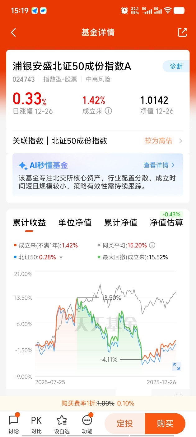 浦银安盛北证50费率低不限额,7天免赎回费,北证50有30cm高弹性,专精特新企