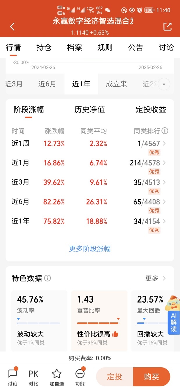 最近这业绩真的是嘎嘎香呀,已经连续上涨了一股天了,$永赢数字经济智选混合发起C$ 主投国产算力,优质赛道就是爆发力强。最近一周的涨幅为12.73%,排名来到了同类第一。这优异的表现离不开经理的实力,同时也说明紧跟市场脚步也是非常重要的。25年或是AI应用层爆发式增长的一年,而我国有望在Deepseek的爆发下深度参与下半场,带来的算力需求将让AI算力的走的更远。毕竟这最近半年的业绩就已经有82.26%了。#纳指终结4连跌,中概强势上攻# #DeepSeek火爆全球,对A股影响几何?#