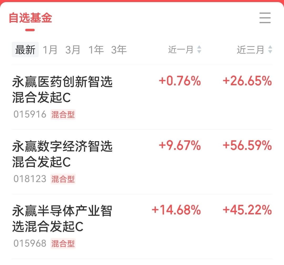 #存储芯片掀涨价潮!投资机会几何?# 当下国产算力赛道正处于蓬勃发展的初期,成长潜力巨大,具备技术含量高,细分领域多且复杂的特点。弹性高赛道潜力大。聚焦国产算力产业链, 短期有波动,随着国内对自主可控算力需求的提升,叠加政策与资本助力,未来有望持续上扬,一起来看看永赢智选系列的表现吧$永赢医药创新智选混合发起C$ 近一个月涨幅+0.76 %,近三个月涨幅+26.65 %;$永赢数字经济智选混合发起C$ 近一个月涨幅+9.67%,近三个月涨幅+56.59%;$永赢半导体产业智选混合发起C$ 近一个月涨幅+14.68%,近三个月涨幅+45.22 %。