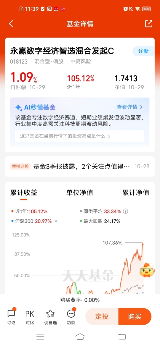 $永赢数字经济智选混合发起C$ ai算力方向,昨天涨幅1.09%,近一年涨幅105.12%,