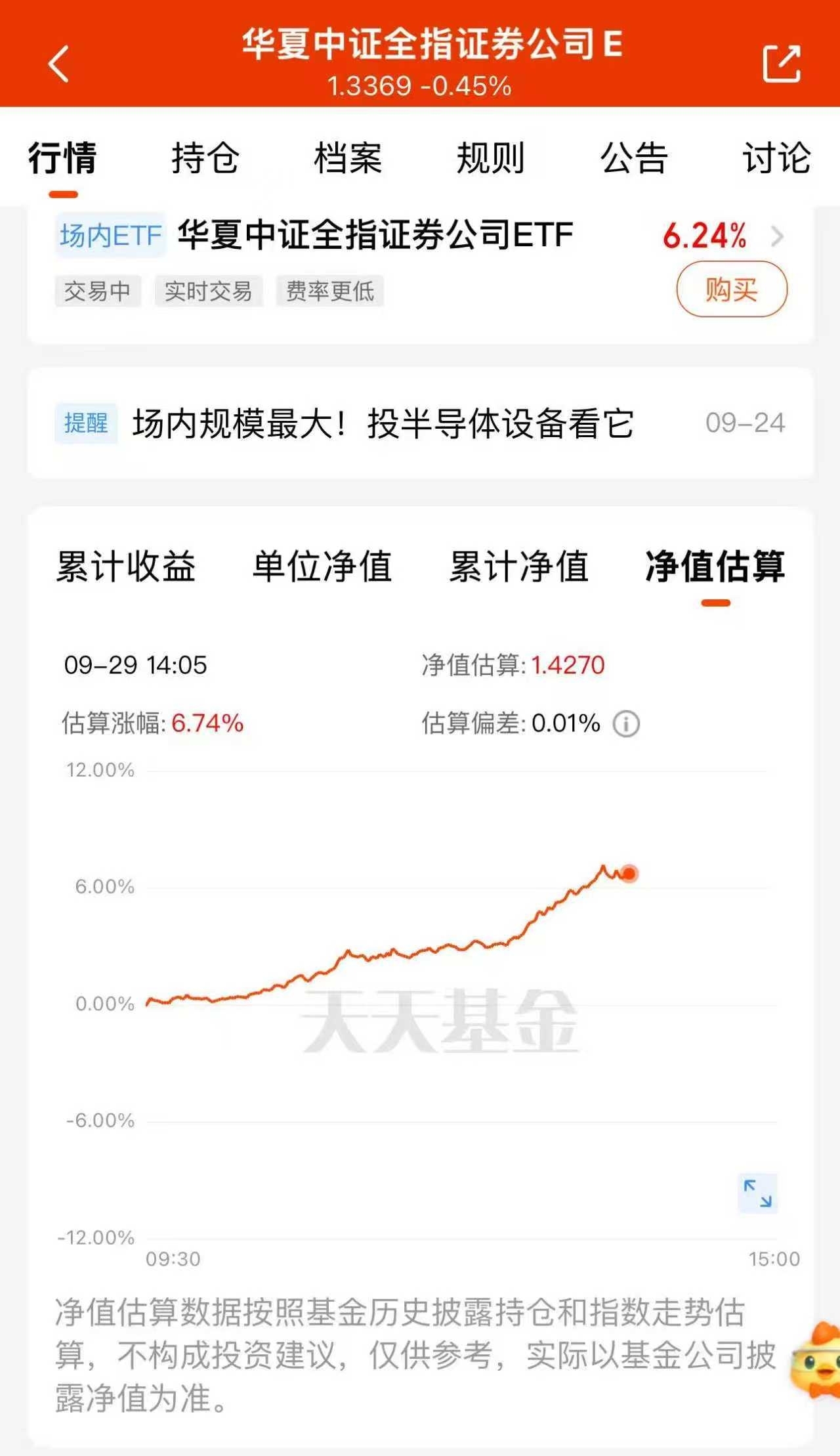 我投的$华夏中证全指证券公司ETF联接C$大涨啦!估值超6%,券商板块反弹动力已