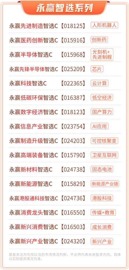 风险提示:投资有风险,投资须谨慎。基金管理人承诺以诚实信用、勤勉尽责的原则管理和运用基金资产,但不保证本基金一定盈利,也不保证最低收益。本基金的过往业绩及其净值高低并不预示其未来业绩表现,基金管理人管理的其他基金的业绩并不构成对本基金业绩表现的保证。投资不同类型的基金将获得不同的收益预期,并承担不同程度的风险。通常基金的收益预期越高,风险越大。以上基金均属于中等风险(R3)产品,适合经客户风险承受能力等级测评后结果为平衡型(C3)及以上的投资者。基金风险等级与投资者风险承受能力等级对照表详见永赢基金官网。投资者通过代销机构提交交易申请时,应以代销机构的风险评级规则为准。以上基金可投资于港股通标的股票,除了需要承担与境内证券投资基金类似的市场波动风险等一般投资风险之外,还面临汇率风险等境外证券市场投资所面临的特别投资风险。敬请投资者在做出投资决策之前,仔细阅读产品法律文件,充分认识本基金的风险收益特征和产品特性,充分考虑自身的风险承受能力,理性判断并谨慎做出投资决策。