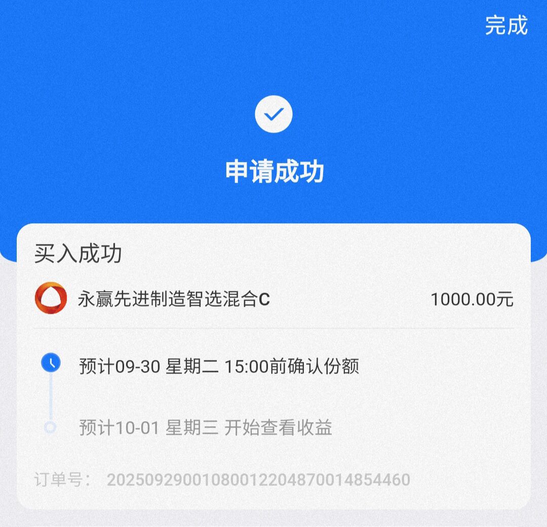 今日买入1000$永赢先进制造智选混合发起C(OTCFUND|018125)$,该基金是人形机器人混合基金,相对于机器人指数弹性较大,由于今年科技主线,再加上机器人利好不断,因此使得该基金在本轮科技行情中表现也是比较突出,今年累计涨幅97.66%,近1年收益204%。