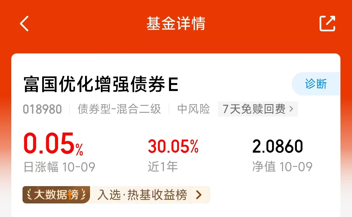 今天跌不少,但我一点不慌,一个是我有信心,另一个是我买的是$富国优化增强债券E$(018980)。这个债主要是有4成债仓,6成增强仓,能做个缓冲,万一跌下来心态也比股基好。这个债一年也能赚30%,算是比较能跟上热点的。有这这基金在手,还有一些半导体的基金,我今年收益还可以。#分享国庆见闻,晒收益,瓜分好礼!#