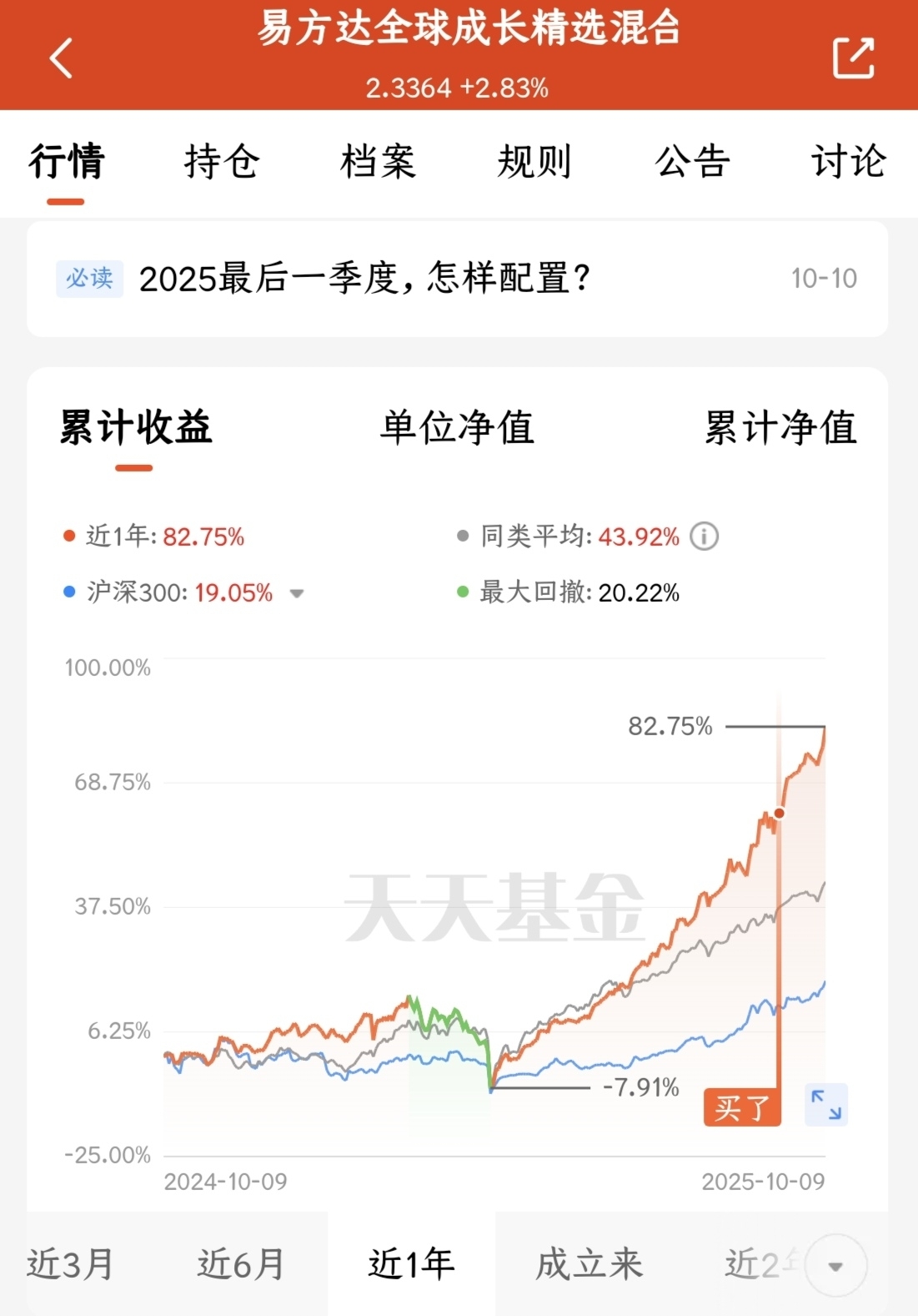 当前降息周期下,全球科技资产迎来机遇:美股AI与机器人领先,A股算力基建关键,港股互联网巨头受益AI应用落地。$易方达全球成长精选混合(QDII)人民币C$ 基金凭借稀缺的全球配置优势,展现稳健业绩与出色调仓能力。该产品国庆期间表现优异,近期调整或为布局良机,基金经理精准择时能力值得信赖,是分散风险、把握全球机遇的优质选择。