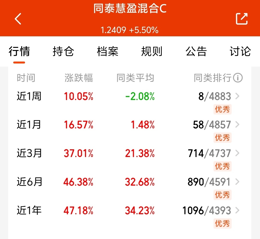 同泰慧盈昨日表现亮眼,单日上涨5.5%,近一周排名全市场第八。基金深耕稀土新材料和白银投资品领域,贵金属属性突出,各阶段业绩持续领先。$同泰慧盈混合C$