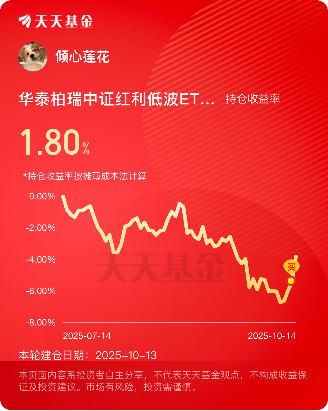 市场最近上蹿下跳的,我的$华泰柏瑞中证红利低波ETF联接C$ 却悄悄五连涨!今天再收0.20%,这种闷声发财的感觉,比追热点踏实多啦。#晒收益# #黄金逼近4200美元!美银:明年5000# #3900点得而复失!A股风格要改了?#