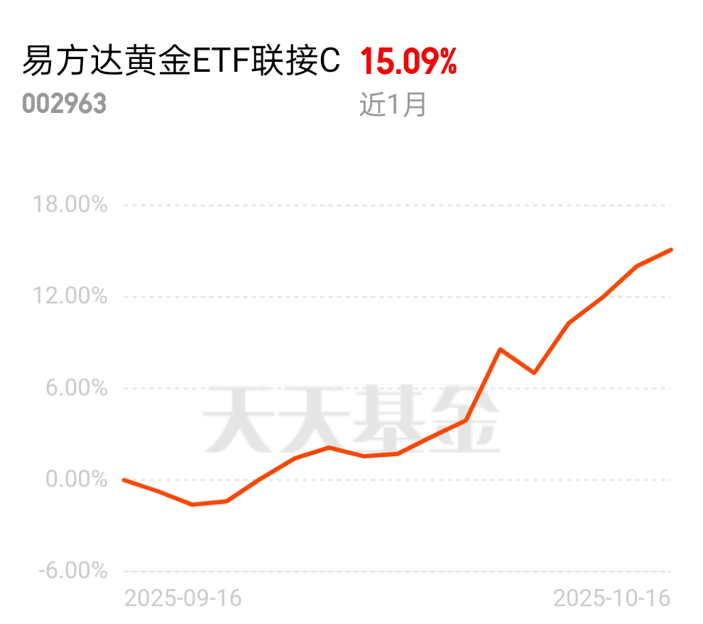 谁还没抓黄金机会?金价创今年最大涨幅,牛市来了。易方达黄金 ETF 联接 C 今天涨 3 个点,近一月 15.09%,近一年 55.21%,同行里突出,博弹性选它。