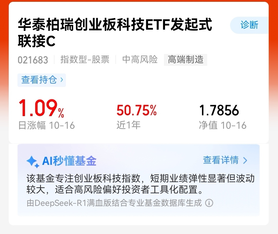 对比了一圈,还是科技类基金最能打。像$华泰柏瑞创业板科技ETF发起式联接C$ ,近6个月收益62.86%,实力摆在这,我选择相信趋势,跌了就买。