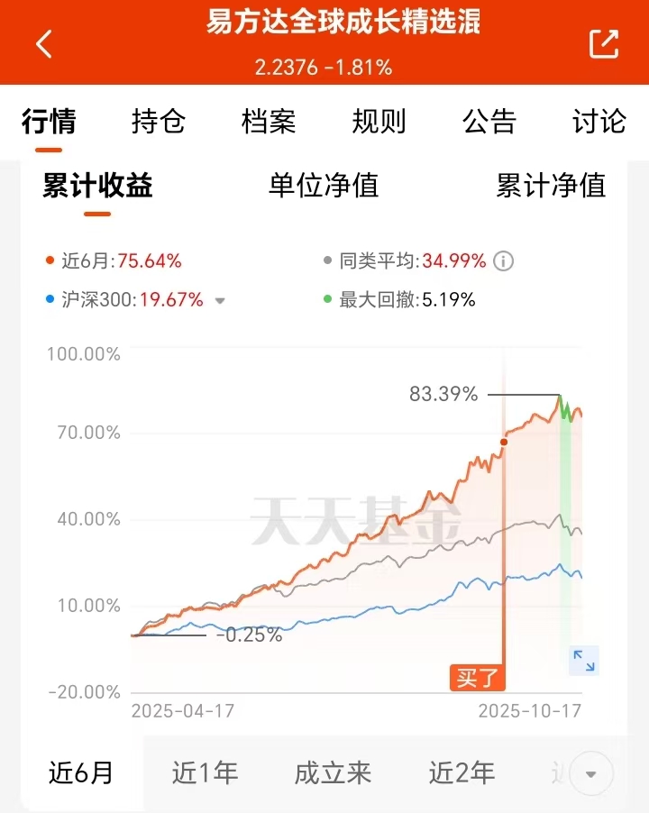 当初选 易方达全球成长精选混合 这个基,就是看中它能投全球市场的稀缺性,很多优质标的在其他基金里难找到。持有这段时间,最直观的感受是稳,就算市场波动,它也没大起大落,长期走势一直比我手里其他几只强。后来留意到经理调仓很及时,能跟着市场节奏调整,这也是它能稳住又能涨的关键,打算继续拿着。