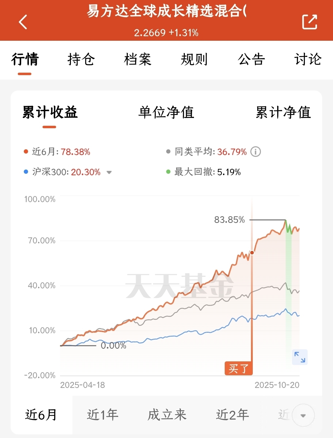 股市震荡,科技板块回调,最近风险增加,不妨布局全球科技。$易方达全球成长精选混合(QDII)人民币C$ 这款产品稀缺性在于可灵活投资全球科技股(A、H、美股),有效规避单一市场风险。基金经理能力突出,精准把握各季度市场机会:一季度重仓港股估值修复,二季度布局美股AI算力,近期及时调仓控制回撤。当前科技板块长期向好,海内外机会丰富,回调正是布局良机。产品全球配置优势明显,配合基金经理高胜率调仓能力,是把握科技行情的优质选择。