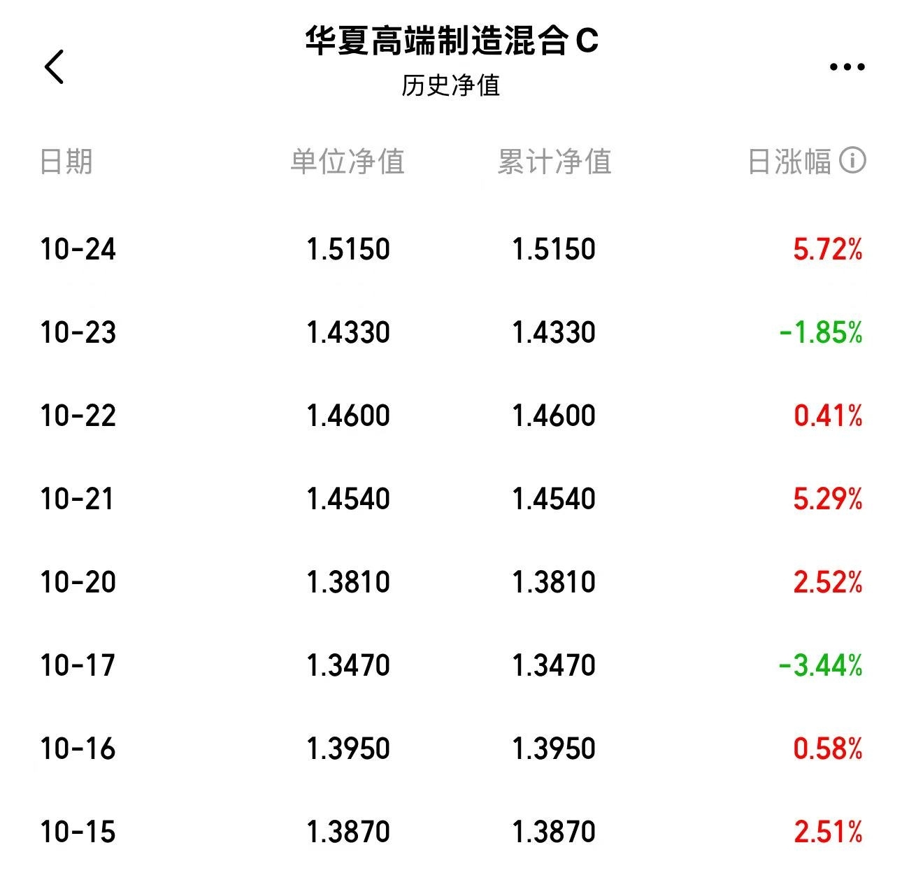 这一轮牛市,科技核高端制造贯穿始终,近3个月收益26.65%,近8天有6天正收益,近1周收益12.47%,上周五1天就收益5.72%,$华夏高端制造混合C$上涨空间和布局都不错