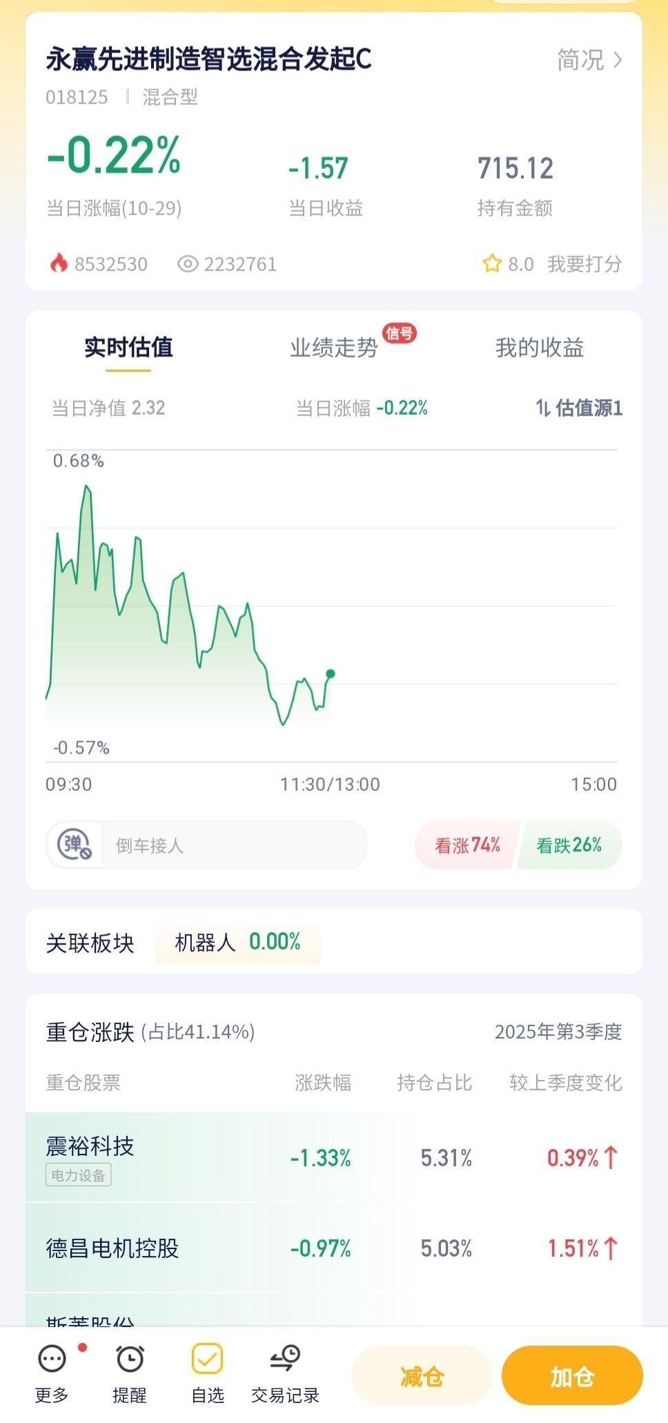今天跌了0.22%。先进制造板块今天不给力,资金好像不太待见,导致这基金也跟着跌了点,不过跌幅不算大,还能接受。