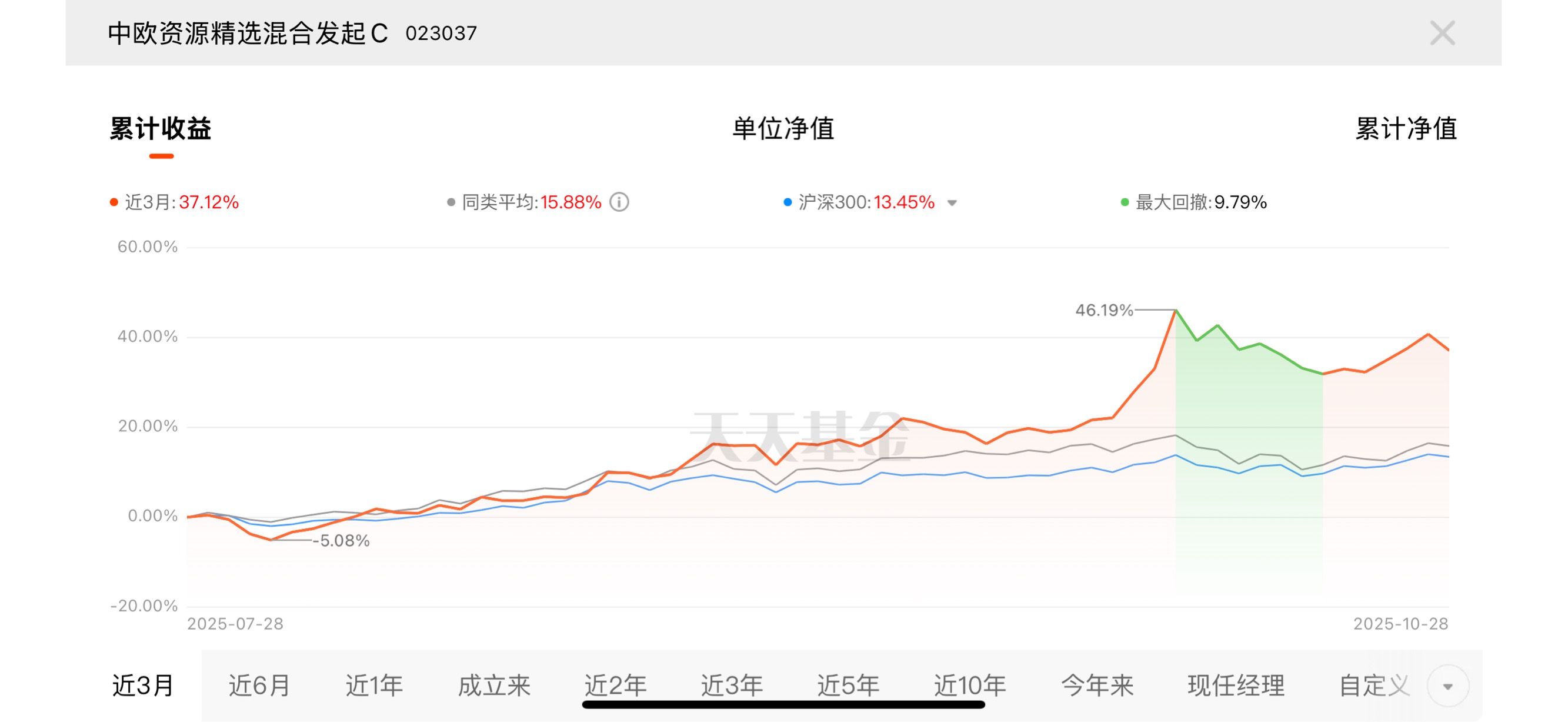 美联储降息落地在即,有色贵金属板块应声反弹,国内反内也见成效。长期持有选主动基,中欧资源精选混合C近3个月37.12%,持仓优质,31.88元红包赶紧领了补仓。