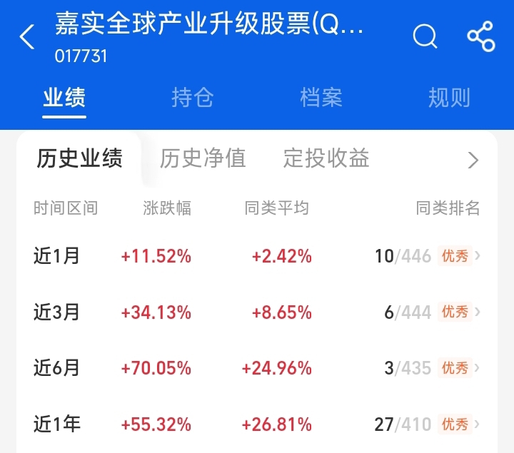 今日市场迎来大惊喜,大盘强势站上4000点!$嘉实全球产业升级股票发起式(QDII)C$ 表现超亮眼,净值涨了2.53。近三个月涨幅达34.13%,近六个月更是高达70.05%,在同类基金中名列前茅。
