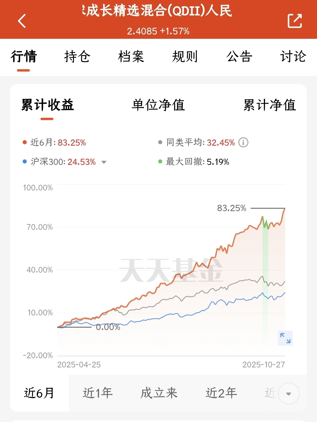 大a调整的时候它在涨,大A涨了,它一起涨。$易方达全球成长精选混合(QDII)人民币C$ 依托全球投资策略灵活规避政治风险,持续把握各地科技机遇。基金经理擅长精准预判及动态调仓,公开季报显示其及时布局港股、美股AI算力等关键机会,近阶段稳健控制回撤。科技行情长期向好,灵活配置助力逢低布局全球市场。