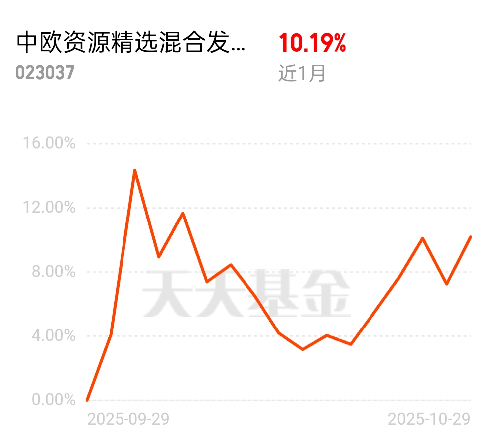 资源板块今天太强势了,稀土、有色全在涨,这波行情抓对了稳赚。中欧资源精选混合C正好重仓这些,基金经理主动选股调仓,近1个月10.19%,详情页能领红包,别错过了。
