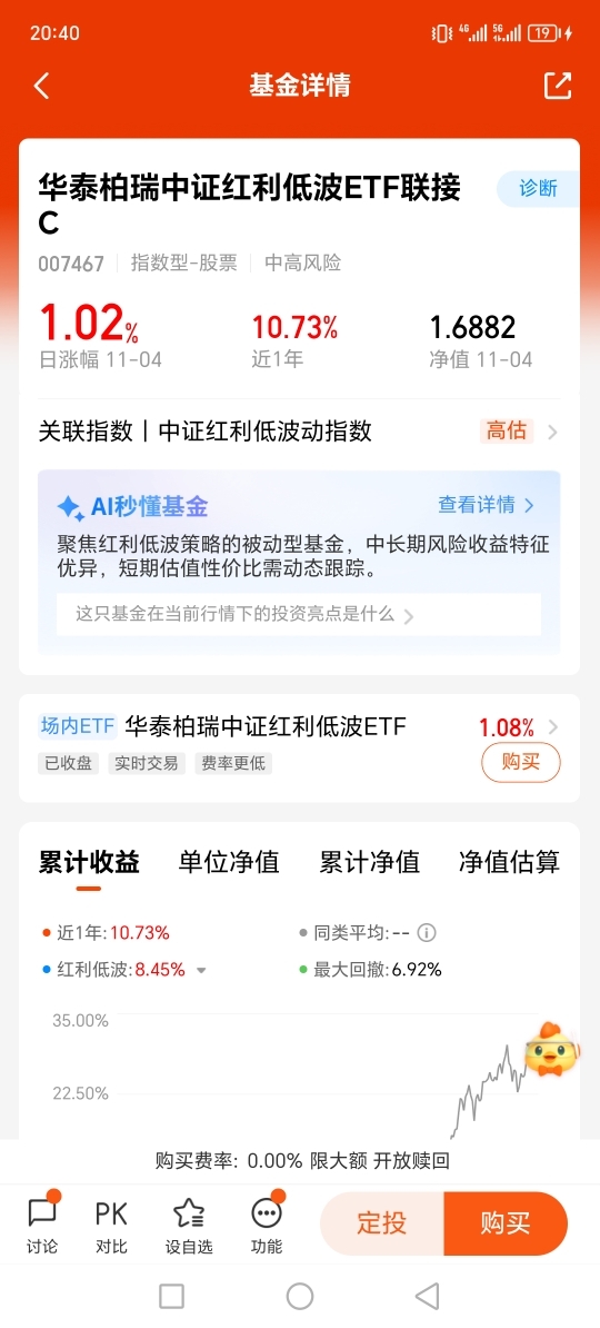 今天红利低波板块涨了1.02%,华泰柏瑞也跟着吃肉!近1年收益10.73%,比同
