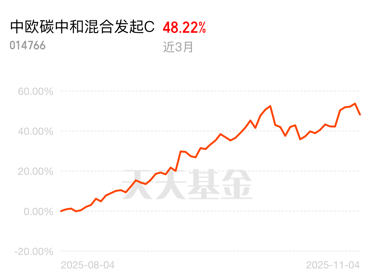 这几天行情真差,科技股一路往下探,半导体和CPO领跌,账户亏得心疼。还好持有的中欧碳中和混合C很争气,近3个月涨48.22%,持仓踩在政策风口上,总算没白等。