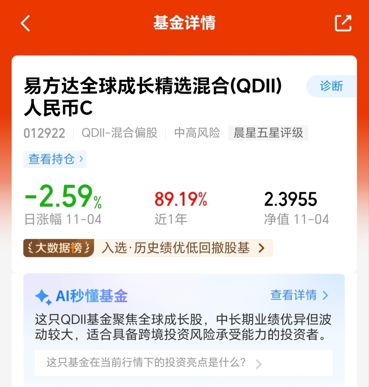 今日市场行情迎来集体上涨反弹,大科技更是带来率先领涨行情,也可见科技长期向上趋势明显,我觉得无论是海内外都有很大机会,特别是$易方达全球成长精选混合(QDII)人民币C$ 投资策略以全球科技为主,精准把握多个市场的科技成长机遇,在当下行情中非常具有稀缺性,基金经理对全球市场都有着敏锐的布局,能够及时预判市场趋势,抓住市场上涨行情,从而使其收获满满!