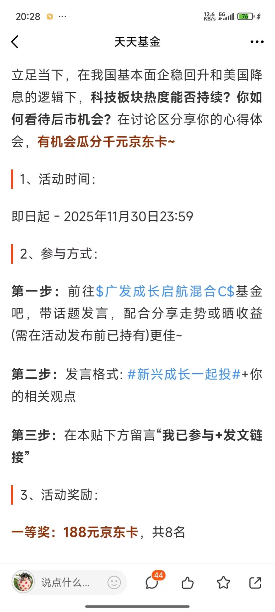 萌新一个,广发成长启航C(018836)和#新兴成长一起投# 的活动,参与就能领红包,试试能不能抽到588京东卡,而且经理讲得挺明白的。广发成长启航C进半年涨49.87%,调仓精准,把握成长板块机会抓的很好,对理解投资逻辑有帮助,跟我的想法挺合的。成长风格肯定还是主线,多学点没坏处$广发成长启航混合C$