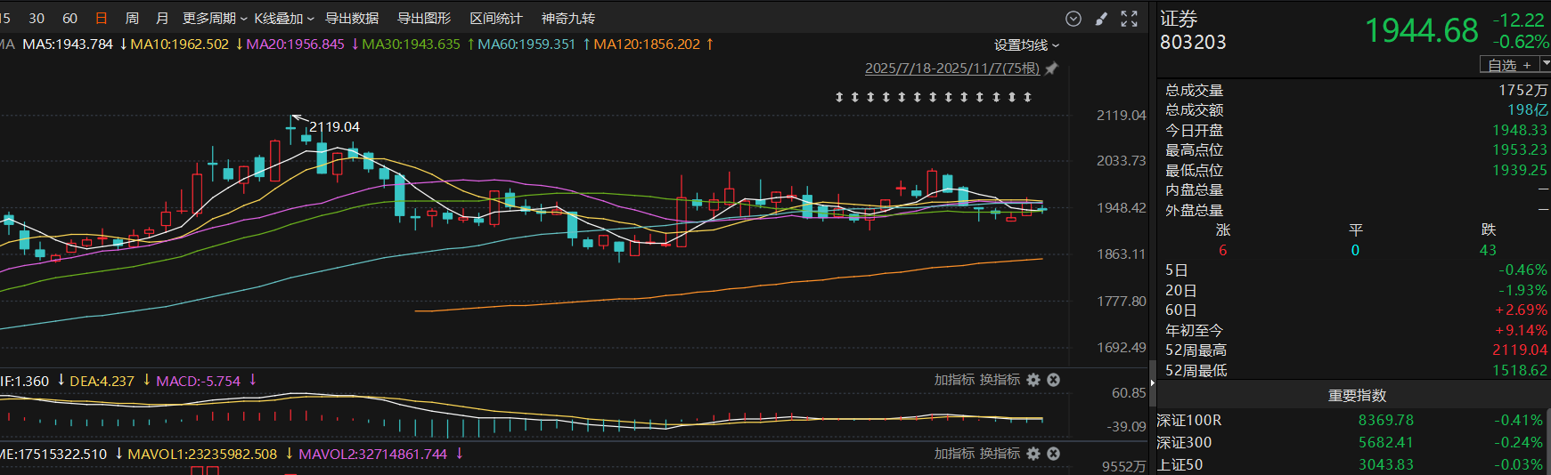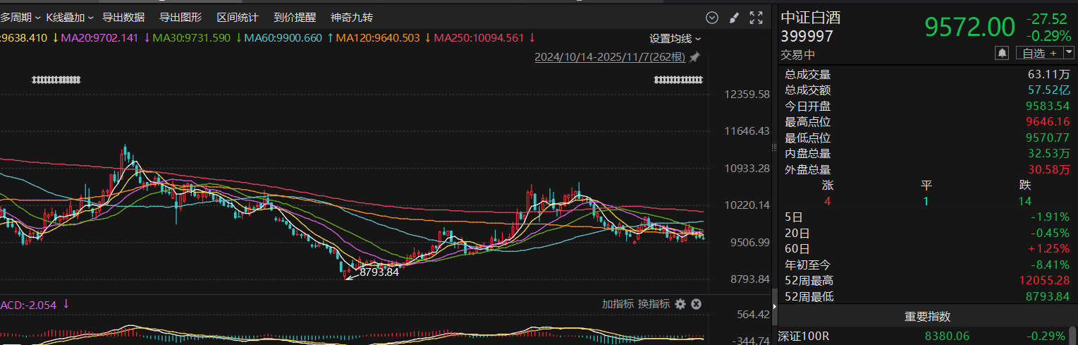 白酒今天小跌走势,距离10.13的前低仅一步之遥,回踩之后再观察支撑力度,实在不行,就是再寻求6.16的支撑,也就是8793,长期均线120、250日均线都开始逐渐走平,我觉得虽然现在基本面下行趋势未变,但是走势上有可能提前止跌