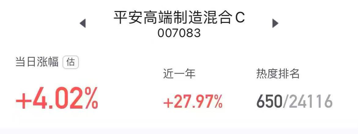 昨天刚加了平安高端制造,今天盘中估值4.02%,很有惊喜,虽然这会有回落,但是我觉得趋势不变。