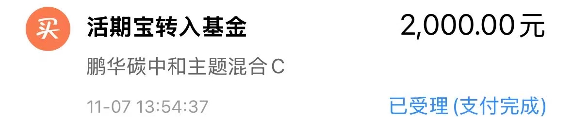 今天我加仓 $鹏华碳中和主题混合C(OTCFUND|016531)$ 2000元