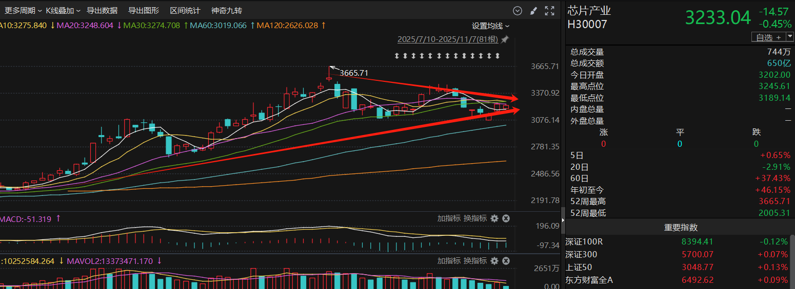 芯片板块今天回调走势,中期趋势还是沿着60日均线向上,短期趋势线有所粘连,收出一个收敛三角,即将选择方向,我觉得回踩60日均线后再跟随科创50一起向上会更健康