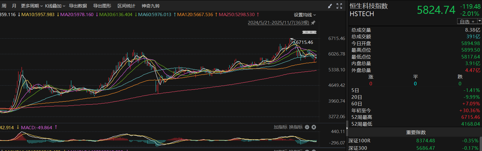 恒生科技今天下跌走势,在周三触及120日均线后走了2天反弹,接下来还是要继续观察回踩120日均线的力度,120日均线的支撑还是有一定的可靠度。