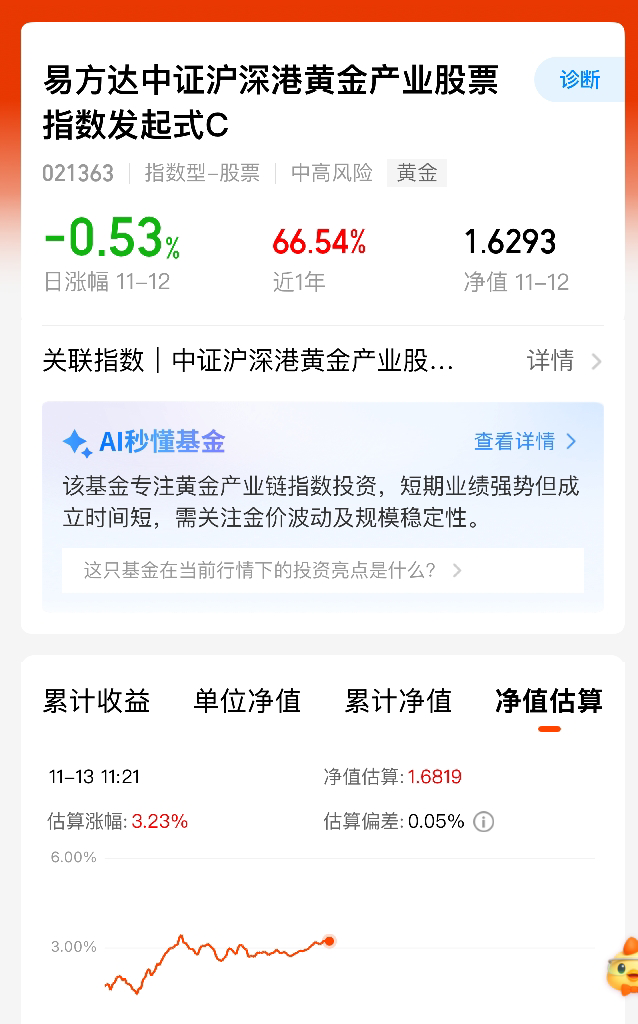 我妈妈一辈子的理财方式就是存银行,怎么劝都没用。今年我让她看了我这只基的业绩曲线和分红记录,她终于动心了,同意拿出一小部分钱尝试一下。能让老一辈人接受新的理财观念,这只基功不可没!$易方达中证沪深港黄金产业股票指数发起式C$