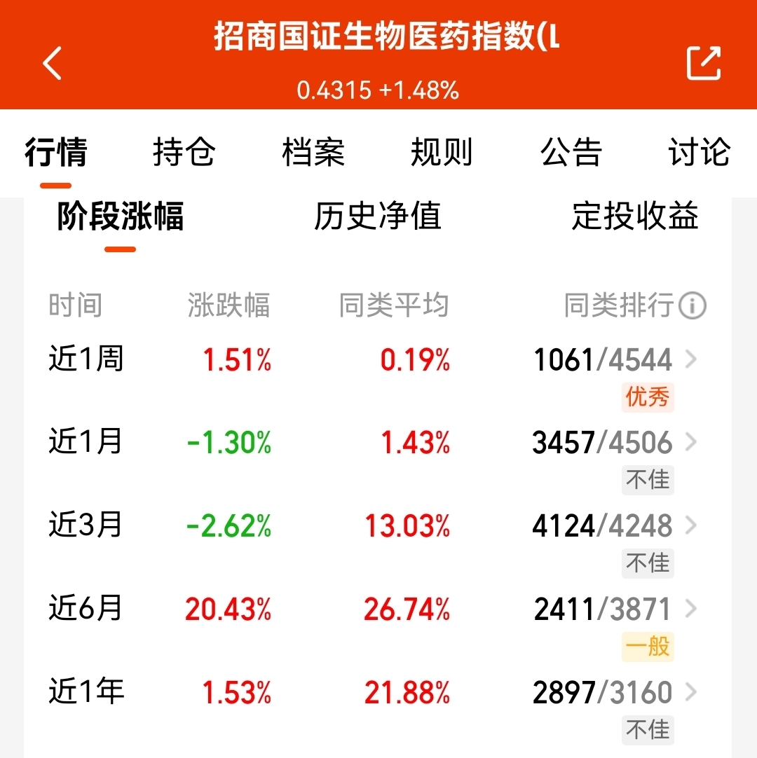 这支$招商国证生物医药指数(LOF)C$ 今天估值也涨超1%,近1周收益1.51%了,跑赢科技板块,近半年涨了20.43%,尤其是近期反内卷相关政策的提出,在生物医药行业也在药品集采层面有所体现,第一批仿制药集采的价格锚点有所松动,不再唯低价是取,这对药企业绩提升是好事;