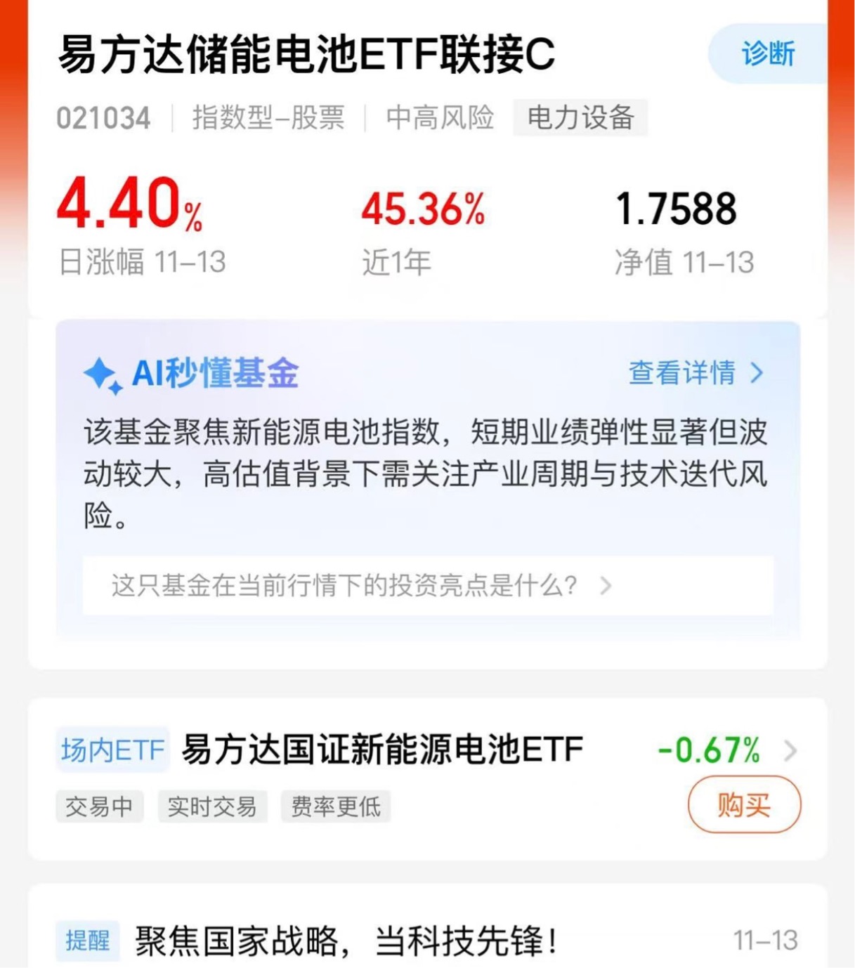 券商板块实在是太渣了,老是骗我感情,还是新能源靠谱点,有实实在在的东西。但我现在也学乖了,不追高那些炒烂的,就找有硬需求、处于初期的。储能电池这个方向,我强烈感觉是未来几年的黄金赛道,现在的调整说不定就是给上车的机会,得把握住。$易方达储能电池ETF联接C$