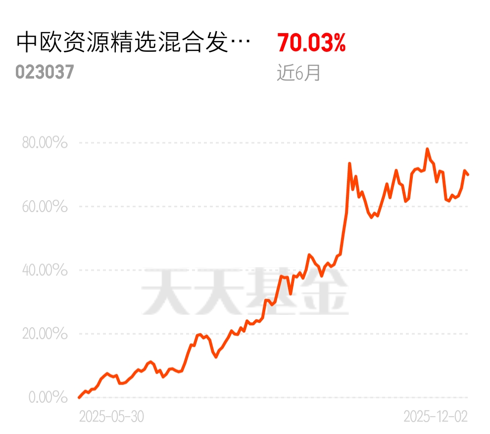 市场对美联储降息的预期一直在升温,资金开始追捧贵金属这类抗通胀资产,资源类基金成了香饽饽。中欧资源精选混合发起 C 近 6 个月 70.03%,配置包含金银等品种,顺应市场趋势,上车安心持有。 $中欧资源精选混合发起C$