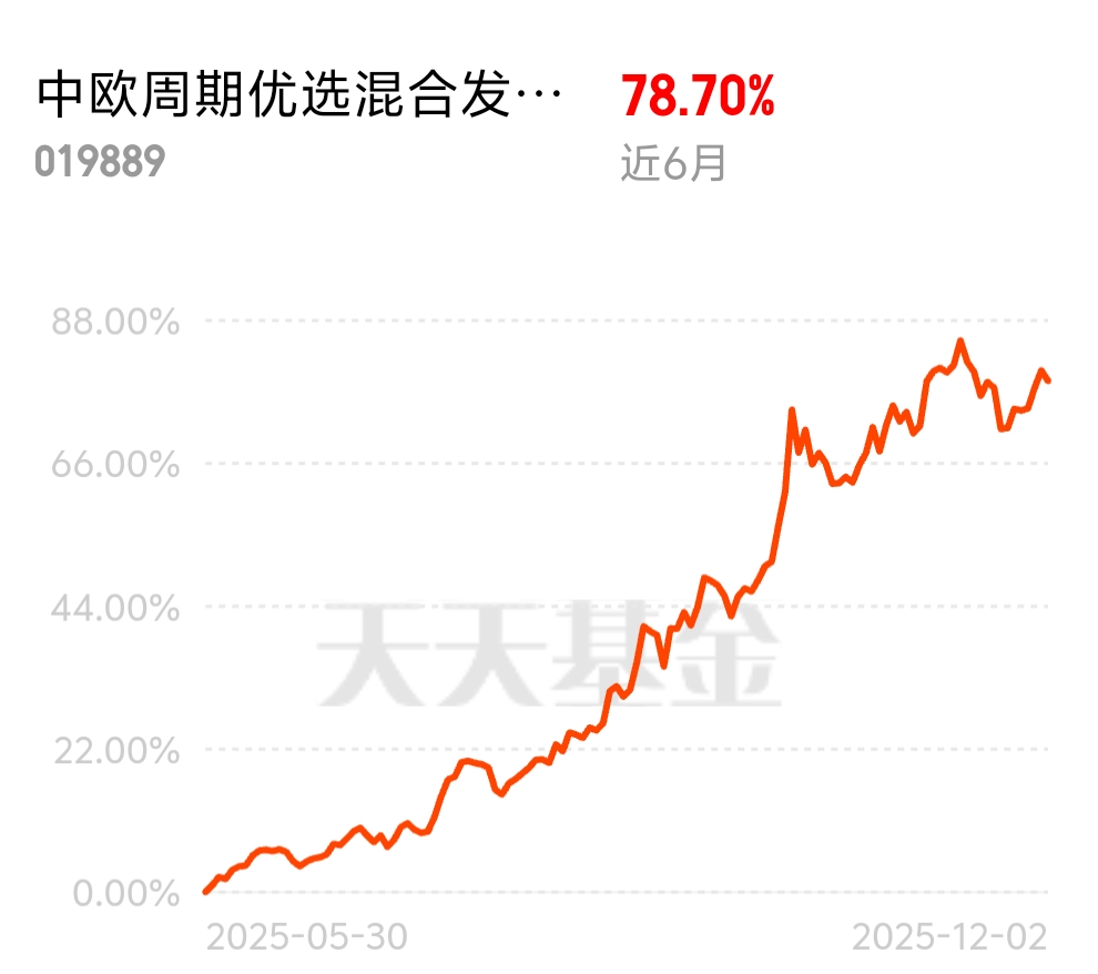 基建赶工进入冲刺阶段,铜、钴、锡等工业金属需求短期激增,推升周期基金净值。中欧周期优选混合发起 C 近 6 个月 78.70%,高度集中周期优质股,调仓精准,涨势凶猛,现在上车正合适。