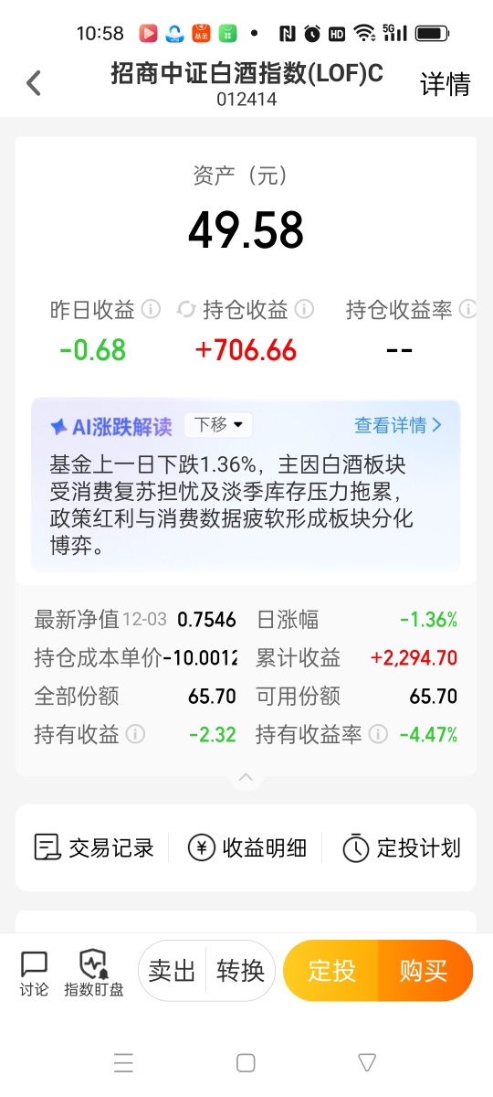 今天上午涨的是人工智能、先进制造、机器人、医药医疗等,跌的最多的是白酒,幸好招商白酒我都在0.78元左右清了,目前看到是0.74元了。可悲可叹呀,这样白酒消费难起来也真的是费劲,经济又不好,一部分百姓又被房贷压死,失业也很多,年轻人就业难度大,原先常喝白酒的那批非富即贵的人都少喝了或者不敢喝了,结婚喜宴也少很多了,如今能看到常孕妇的也很少了,这社会变成这个样子了,也是该如何去面对呢?