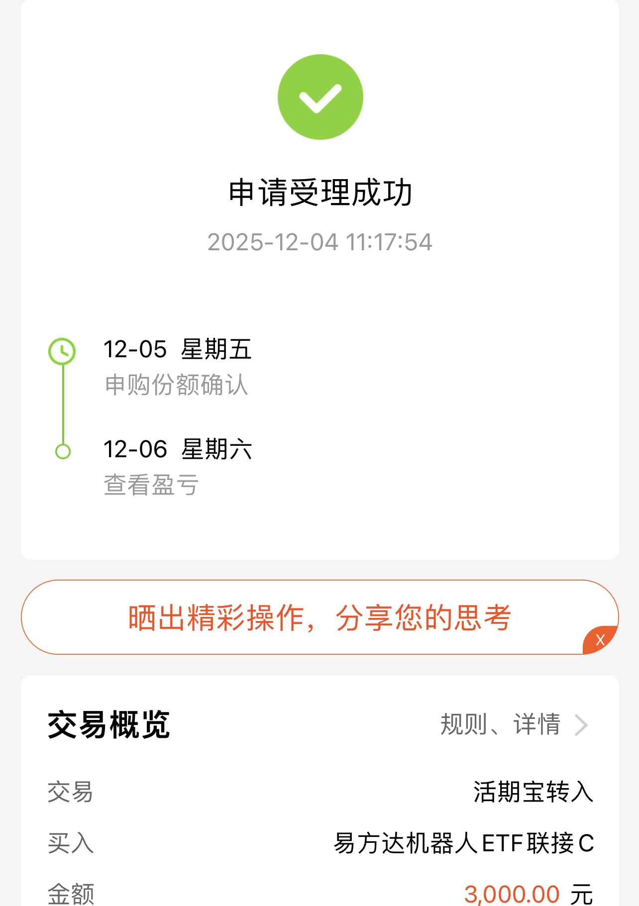 看着这条主线越走越清晰,我今天顺势买入 3000 元的易方达机器人 ETF 联接C,继续把握人形机器人加速落地的中期趋势。