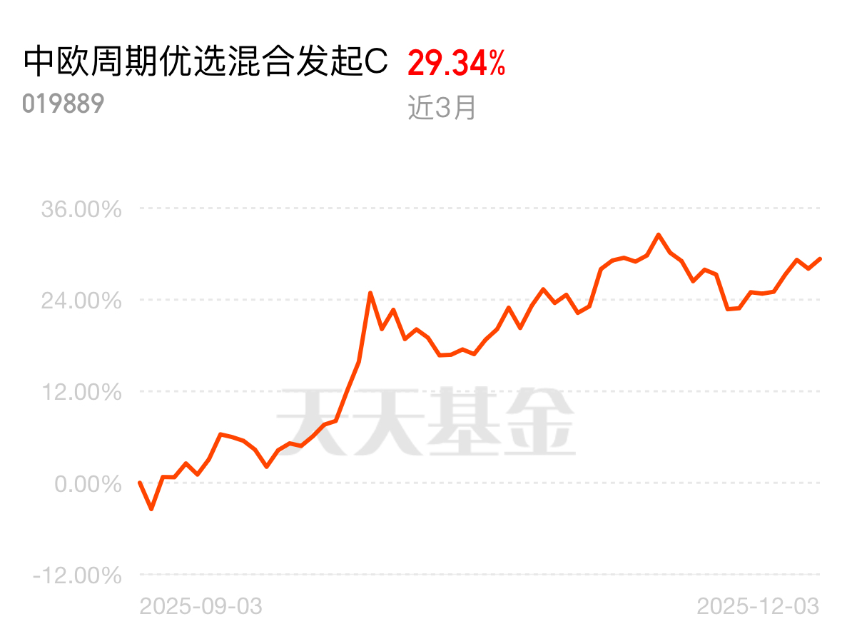 制造业复苏信号明确,企业开工率持续回升,铜、钴等工业金属采购量加大,短期需求预期爆棚。中欧周期优选混合发起 C 近 3 个月 29.34%,踩准需求节点,净值涨不停。