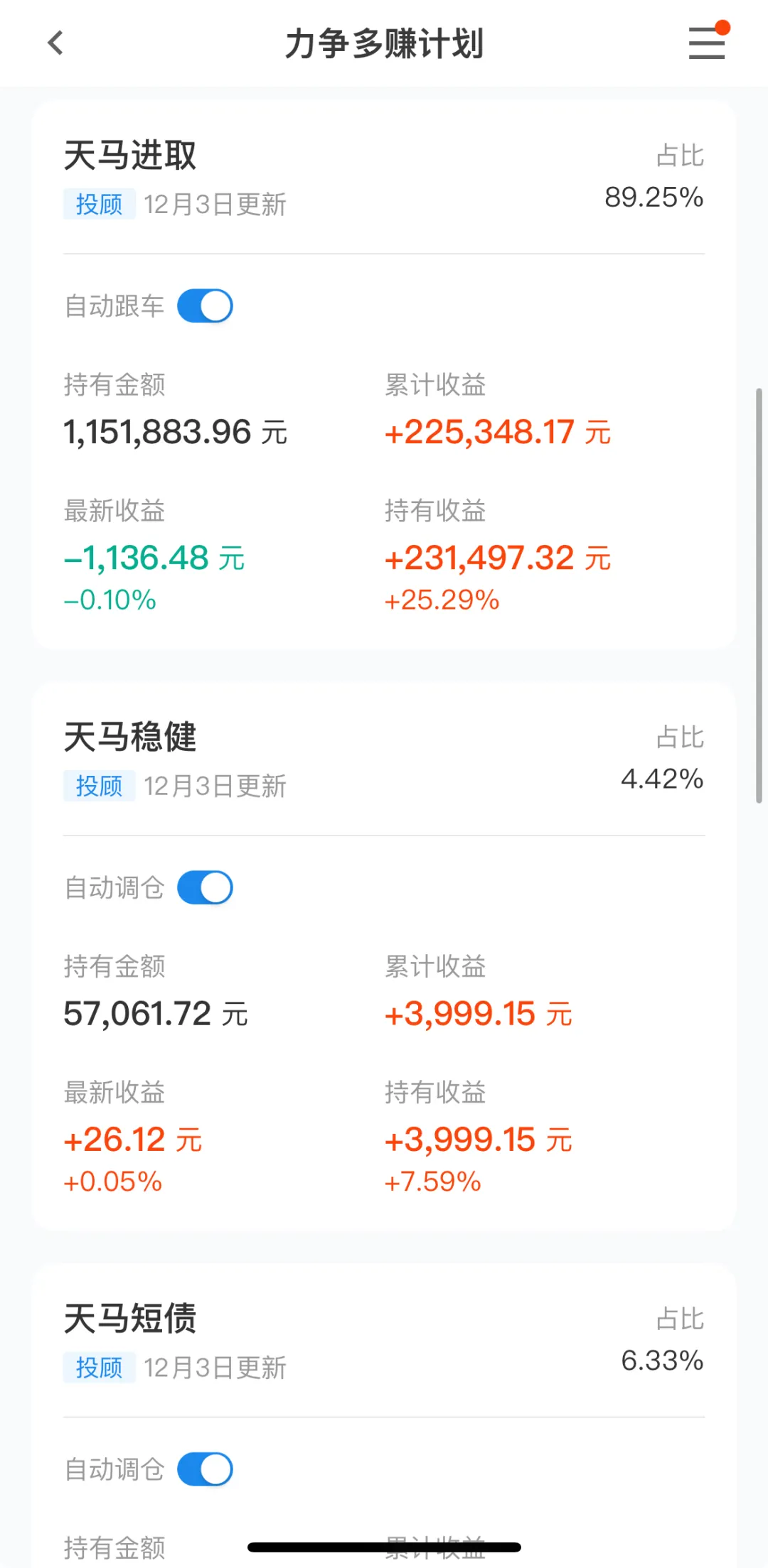 截止昨天(12月3日),我的实盘示范账户中所定投的天马进取组合,盈利约22.5万元,盈利比例约24.3%。