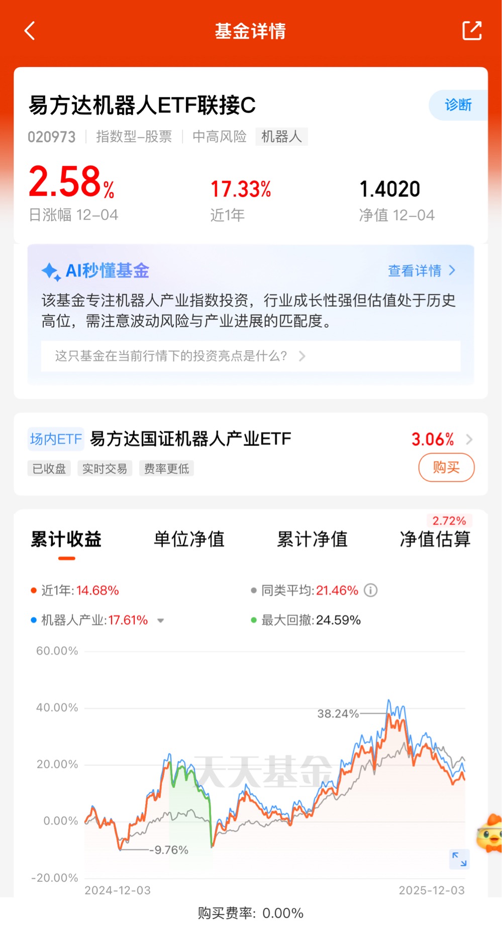 今日机器人板块热度飙升,易方达机器人ETF联接C高开高走,收盘大涨2.58%,表现极为强势。