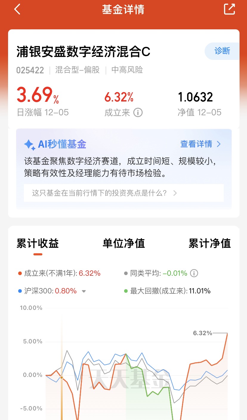今天浦银安盛数字经济隔了1周多,又再次大涨,涨幅3.69%全市场前列,CPO基金