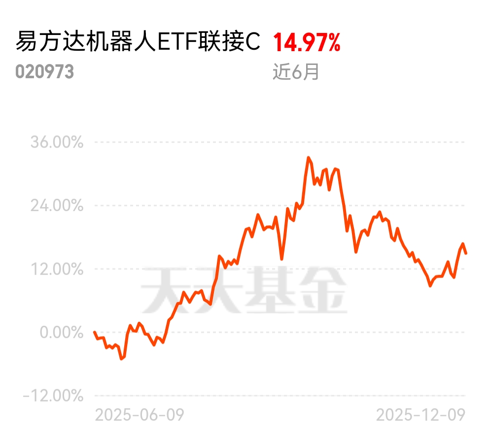 我主要看好这支$易方达机器人ETF联接C$ ,跟踪机器人指数,近1周直接涨了3.41%,近半年收益也有14.97%了,年底也受益于宇树科技IPO,机器人技术更新迭代等利好催化,商业化落地预期加快,叠加年底资金高切低,“电风扇”行情下,机器人板块前期调整又多,较低的估值,也就意味着有明显的反弹性价比,也算是其他科技板块的风险对冲了,我是看好长期的!