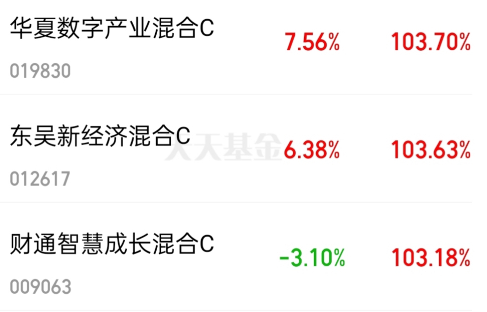 虽然今天科技大调整,但是长期来看是很不错的,近半年都受益翻倍了$富国创新科技混合C$ 近三月收了10多个点,半年收了120多,$华夏数字产业混合C$ 半年收了100多$东吴新经济混合C$ 也收了100多,$财通智慧成长混合C$ 虽然近期表现不佳,但近半年也上涨了一倍