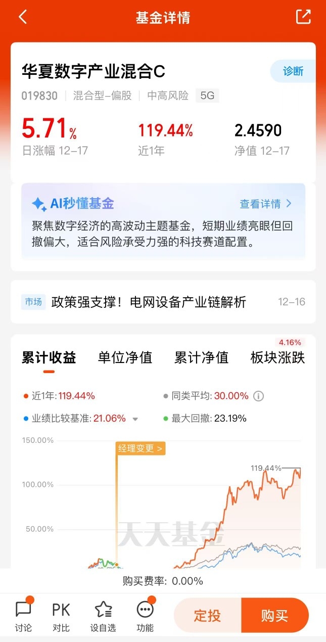 昨天大涨5.71%,短期爆发力好强啊,这基重点投海外算力,近1年119%,在全市场18000多只基金中排35,就按这个节奏来哈,继续支持你$华夏数字产业混合C$