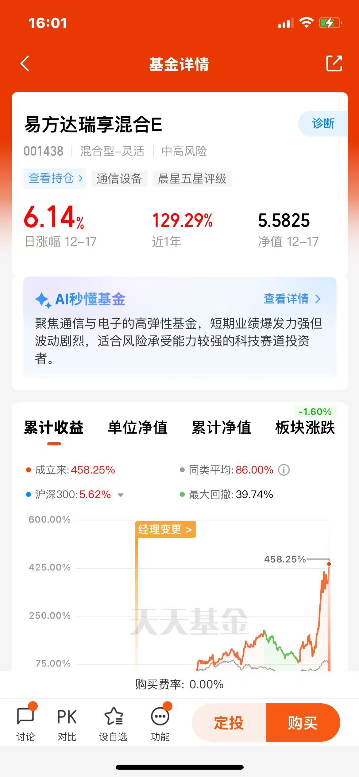 所以说选好主动基真的很重要。在这样的行情下,我一个小白,也是吃到肉了!$易方达瑞享混合E(OTCFUND|001438)$买了没几天就遇到大涨;不得不说CPO是真牛,而这支基金表现甚至比CPO还强!涨幅也比CPO多,今年也是早早就翻倍了