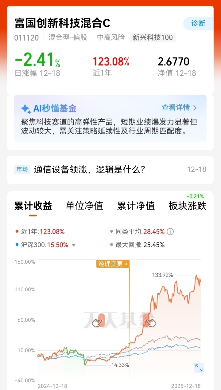 近期市场震荡反复,富国创新科技混合C业绩给力,近一年123.08%、近半年110
