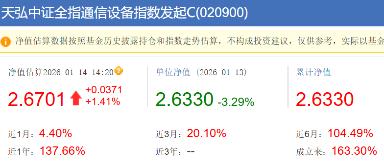 $天弘中证全指通信设备指数发起C$ 我继续做主线,这几天等着回调,也没有机会,那么我继续顺势而为,这段时间AI应用的风口来了,所以我定投加仓一下,这和已经涨了2年的算力板块比,Al应用板块现在估值低,我去博一下补涨行情,