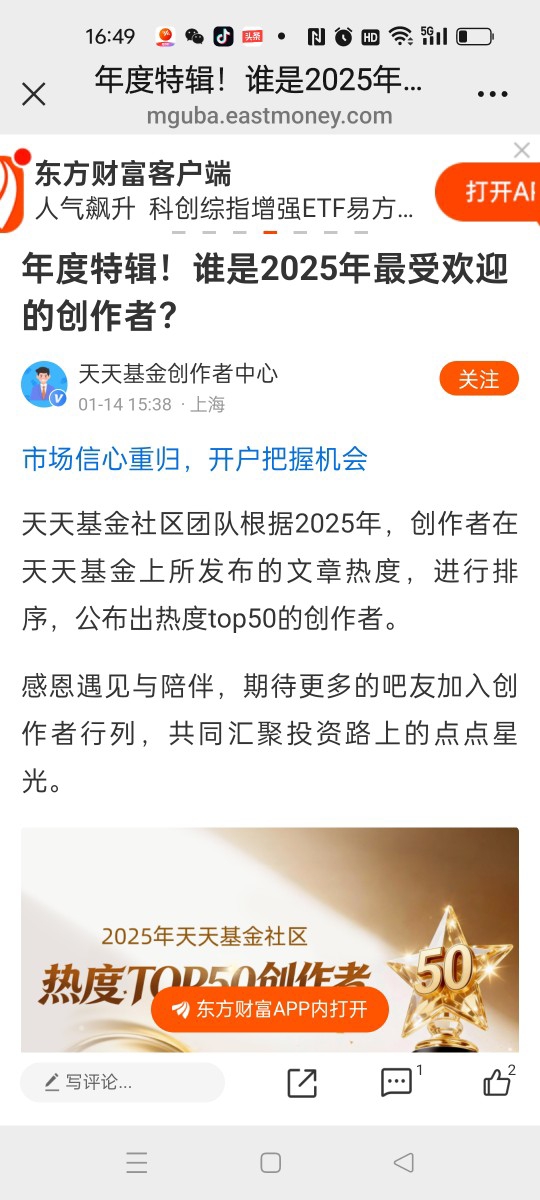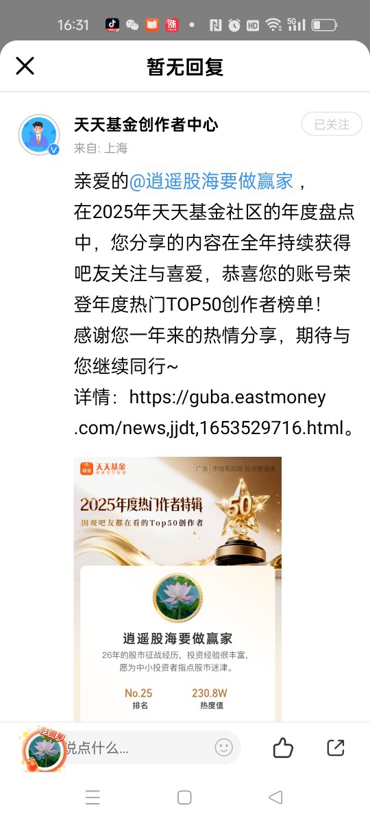 2025年,我在天天基金网里写文章,每日跟粉丝们互动,尽量的去帮助回答投资者的各类问题,提高投资者的操作参与水平和对股市的认知度,也是忙的不亦乐乎。