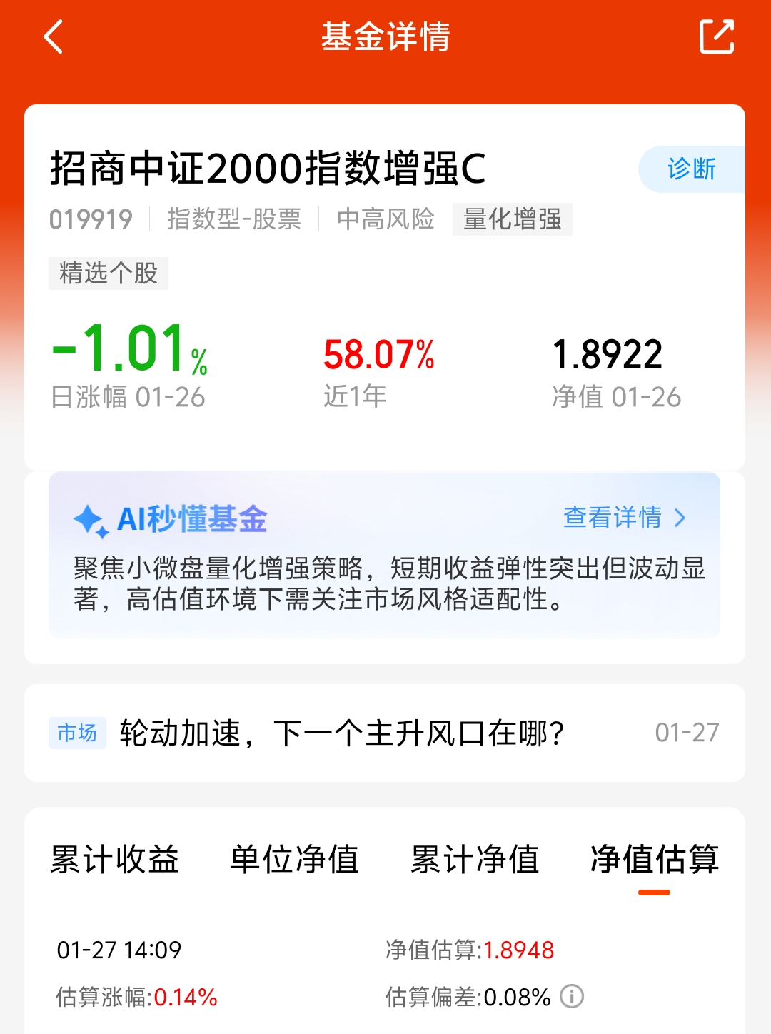 大盘近期波动比较大,今天三大指数拉升上涨,小微盘近期表现不错呢,目前市场流动性充足,利好小微盘,$招商中证2000指数增强C$ 近一年涨了58.07%,看好这个方向,我准备分批布局了!