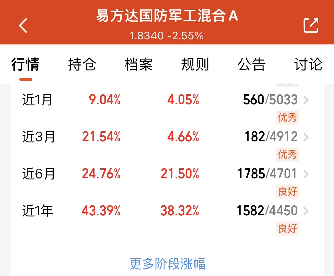 马斯克SpaceX与xAI合并引发市场关注,航空军工板块大涨,商业航天概念持续升温。我打算加仓 $易方达国防军工混合A$ ,它的十大重仓聚焦航空航天装备,在国防高确定性基本盘上,覆盖多只直接或间接涉及商业航天的个股,攻守兼备,是把握当前行情的优质标的。